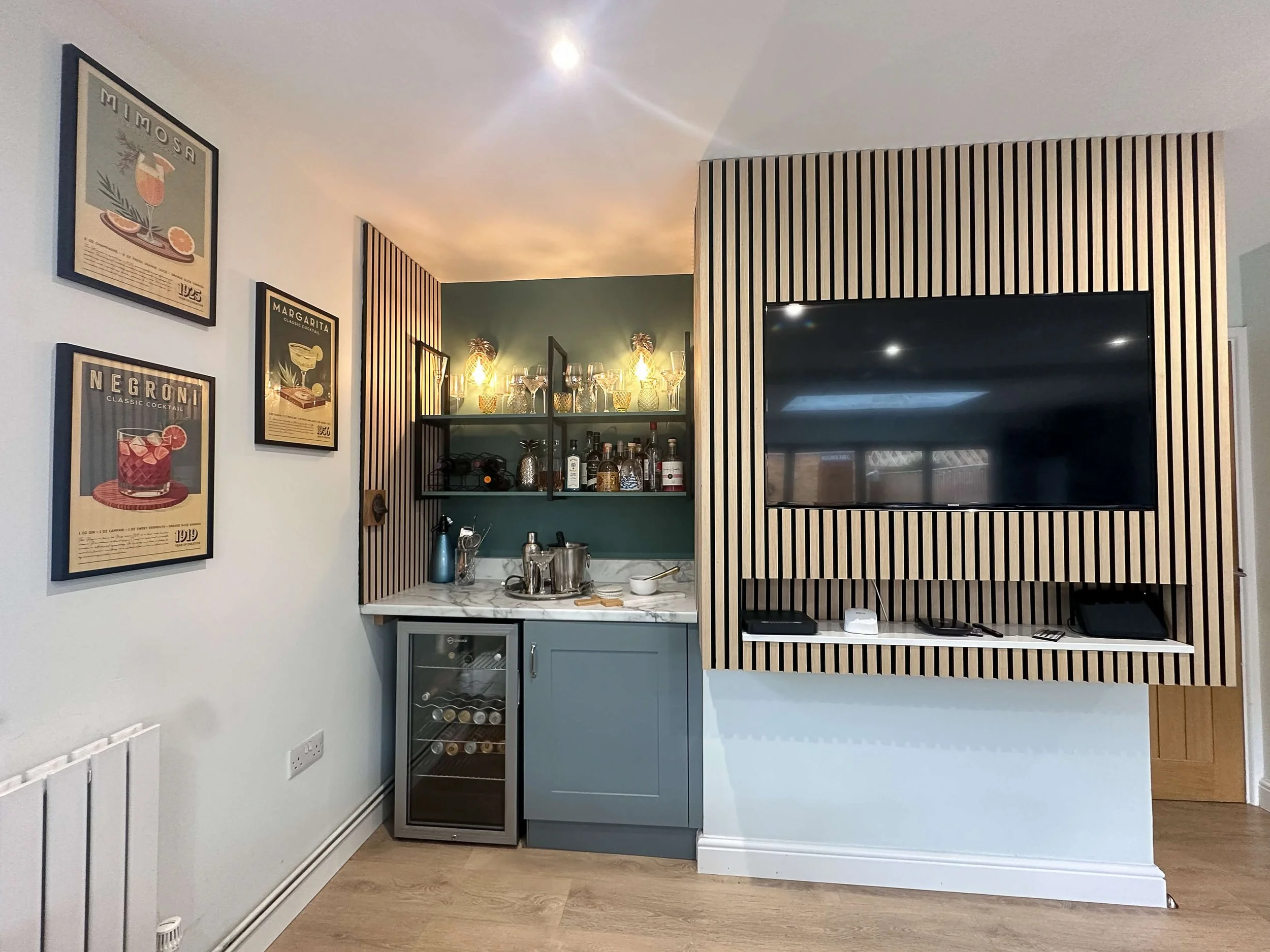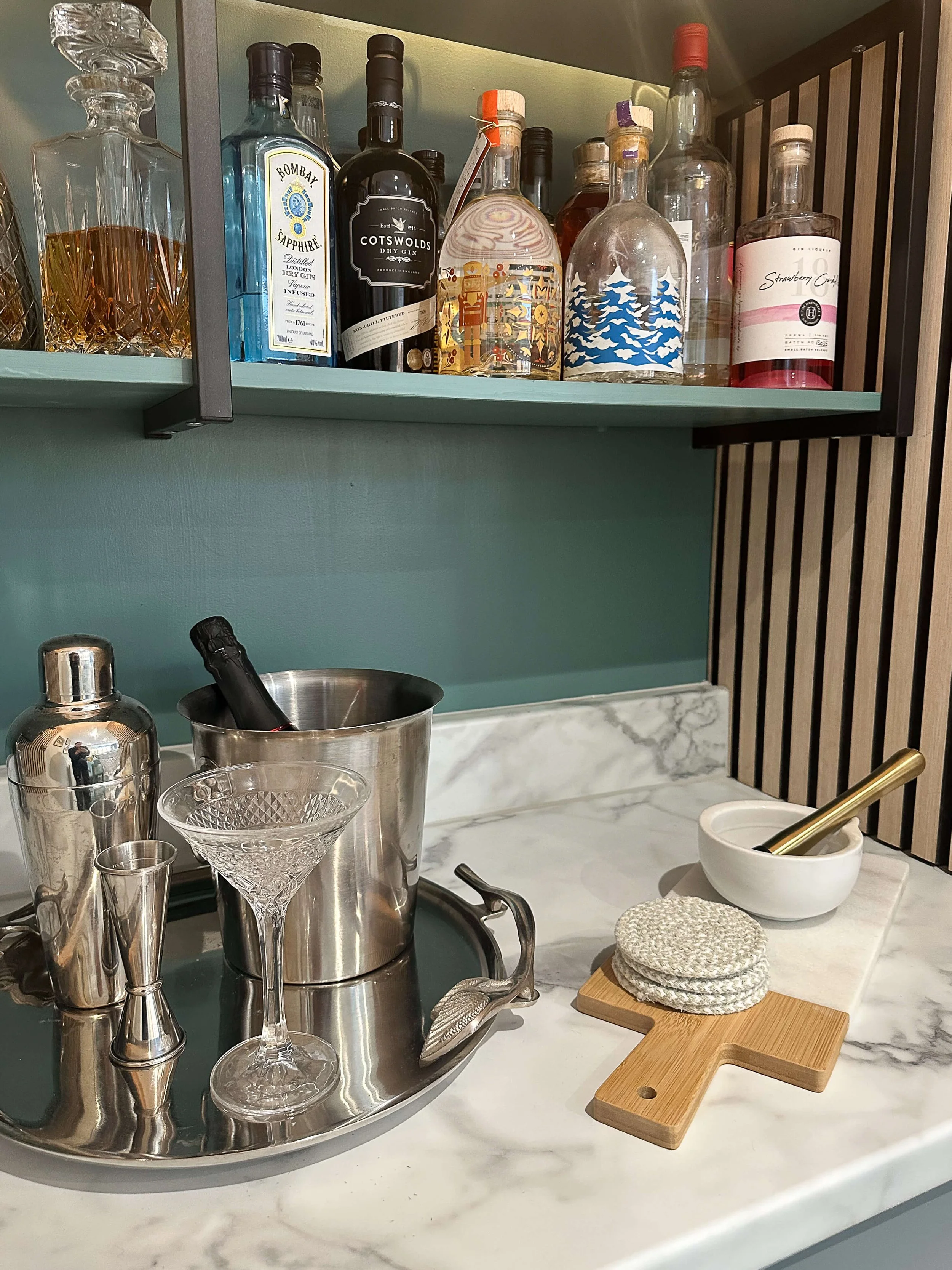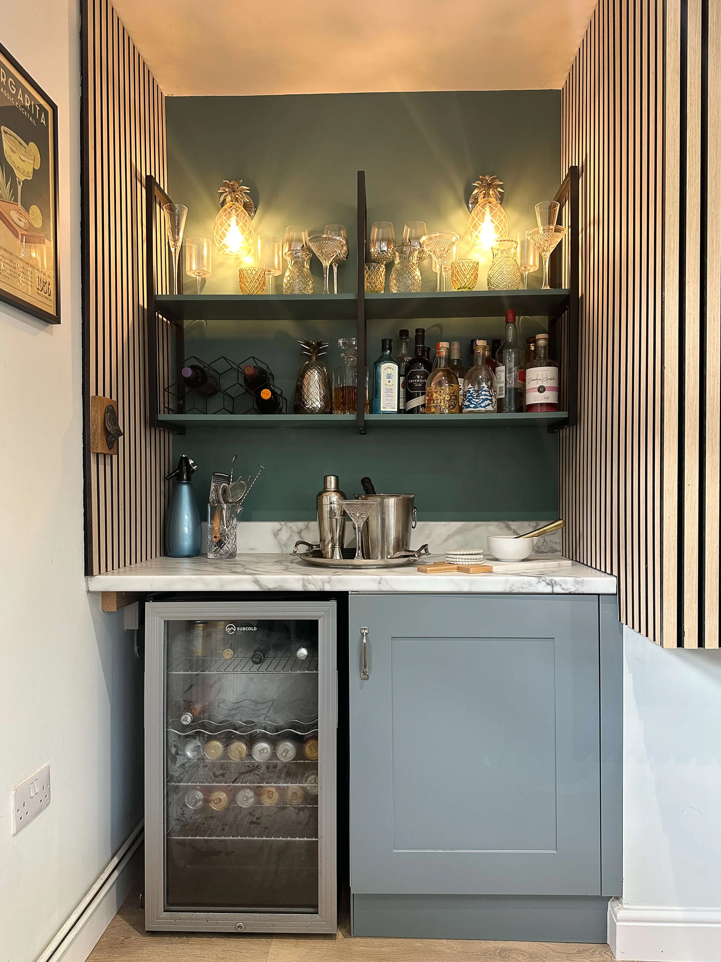 The clients knew they wanted to incorporate acoustic panelling around the TV to create a media wall and nook underneath for their cocker-spaniels’ beds, but weren’t sure what to do with the alcove to the left. After discussing their ideal plans for using the space, the Realm team quickly realised that a bar would be the ideal addition for these clients - an idea which was met with much excitement! After ensuring we could incorporate the same kitchen units and new worktop for consistency, we set about planning the scheme: incorporating a feature wall in a darker teal colour to full focus, continuing the acoustic panelling, adding the pineapple motif through wall lights and cocktail accessories and a drinks fridge (with a wine rack still set to be built in the remaining recess on the left). What was originally a cumbersome cupboard with temporary shelves above became one of the features of the new room layout and a favourite for entertaining.