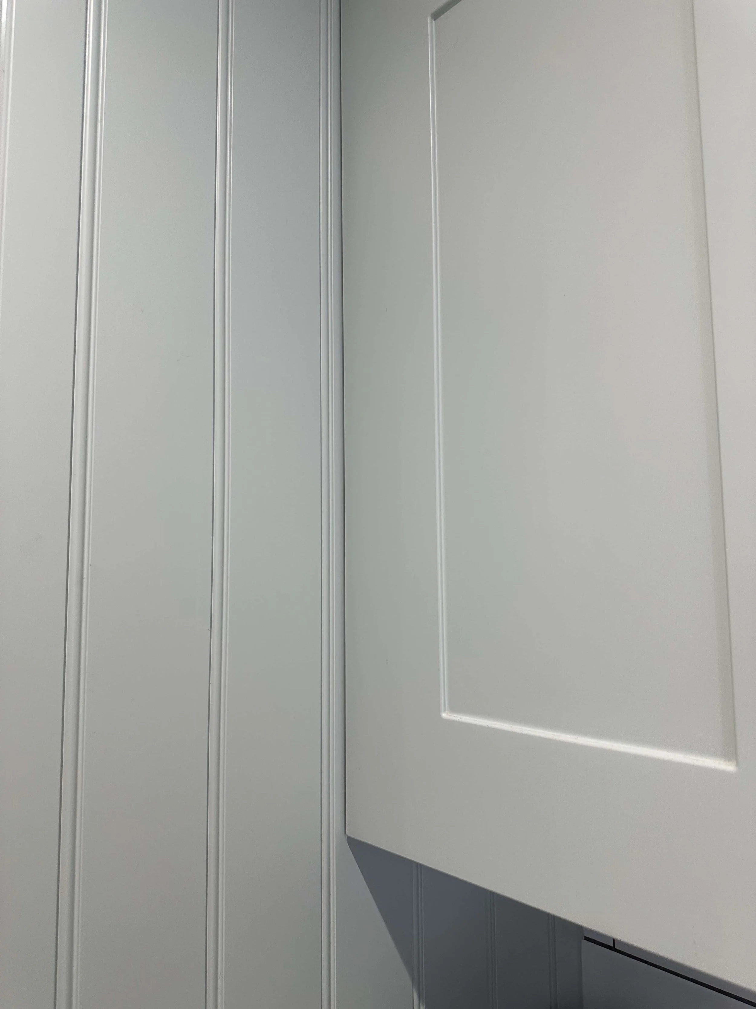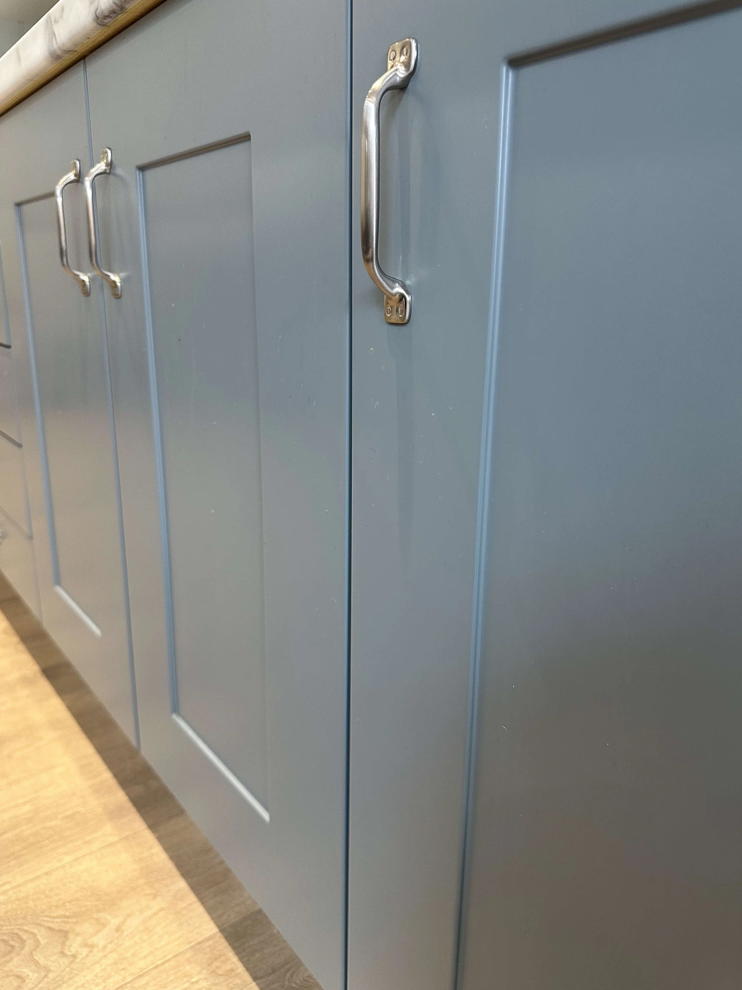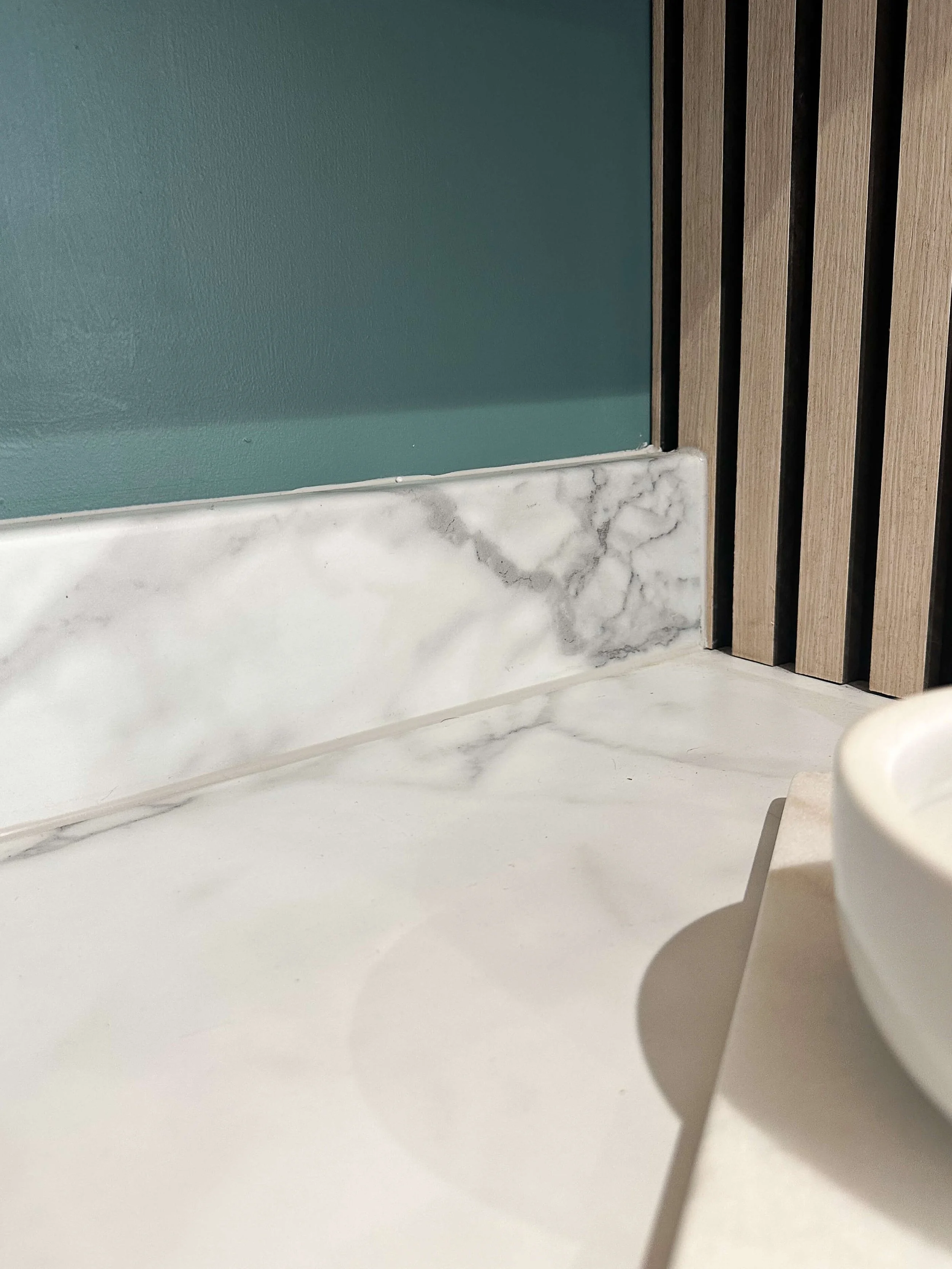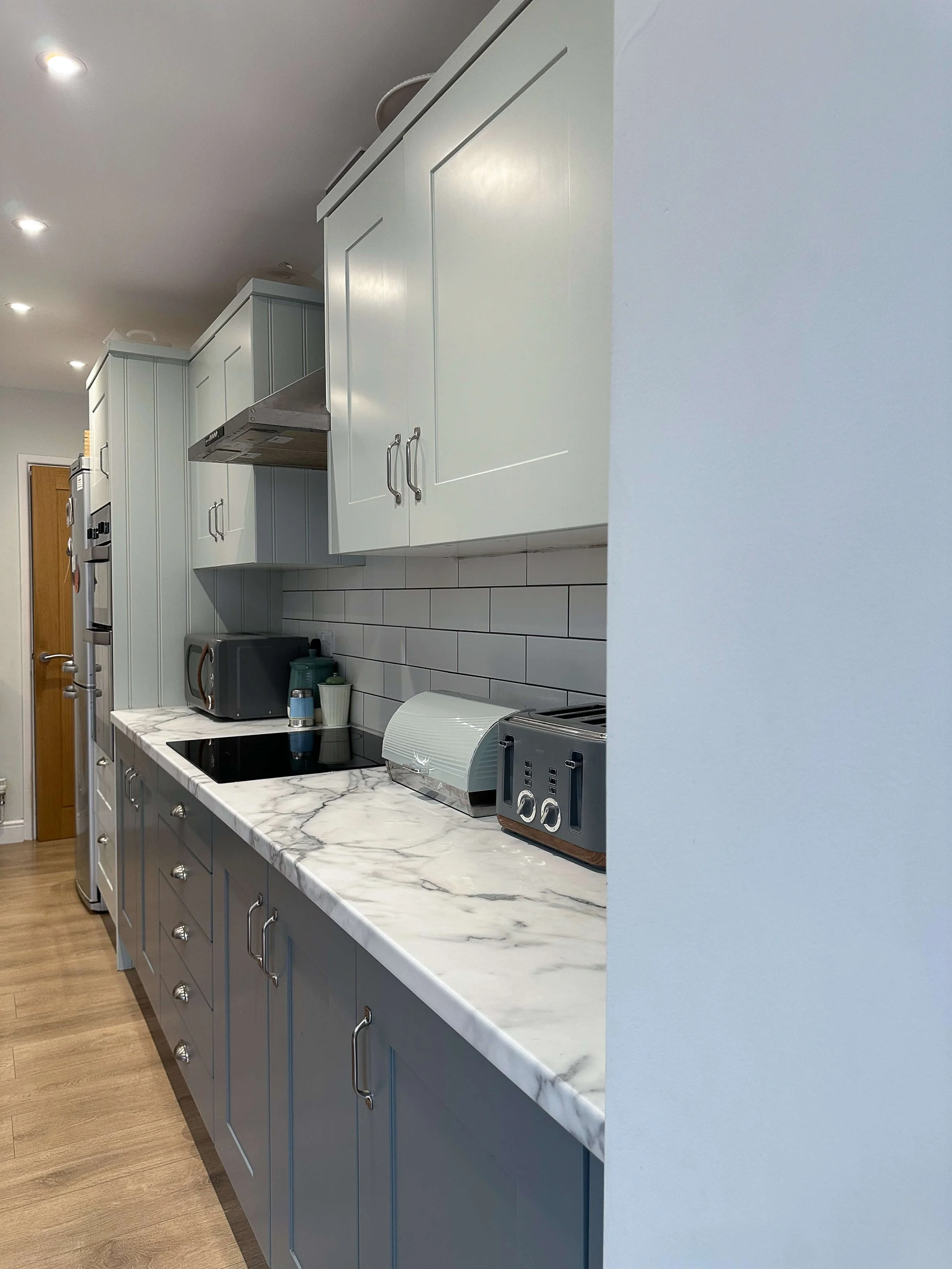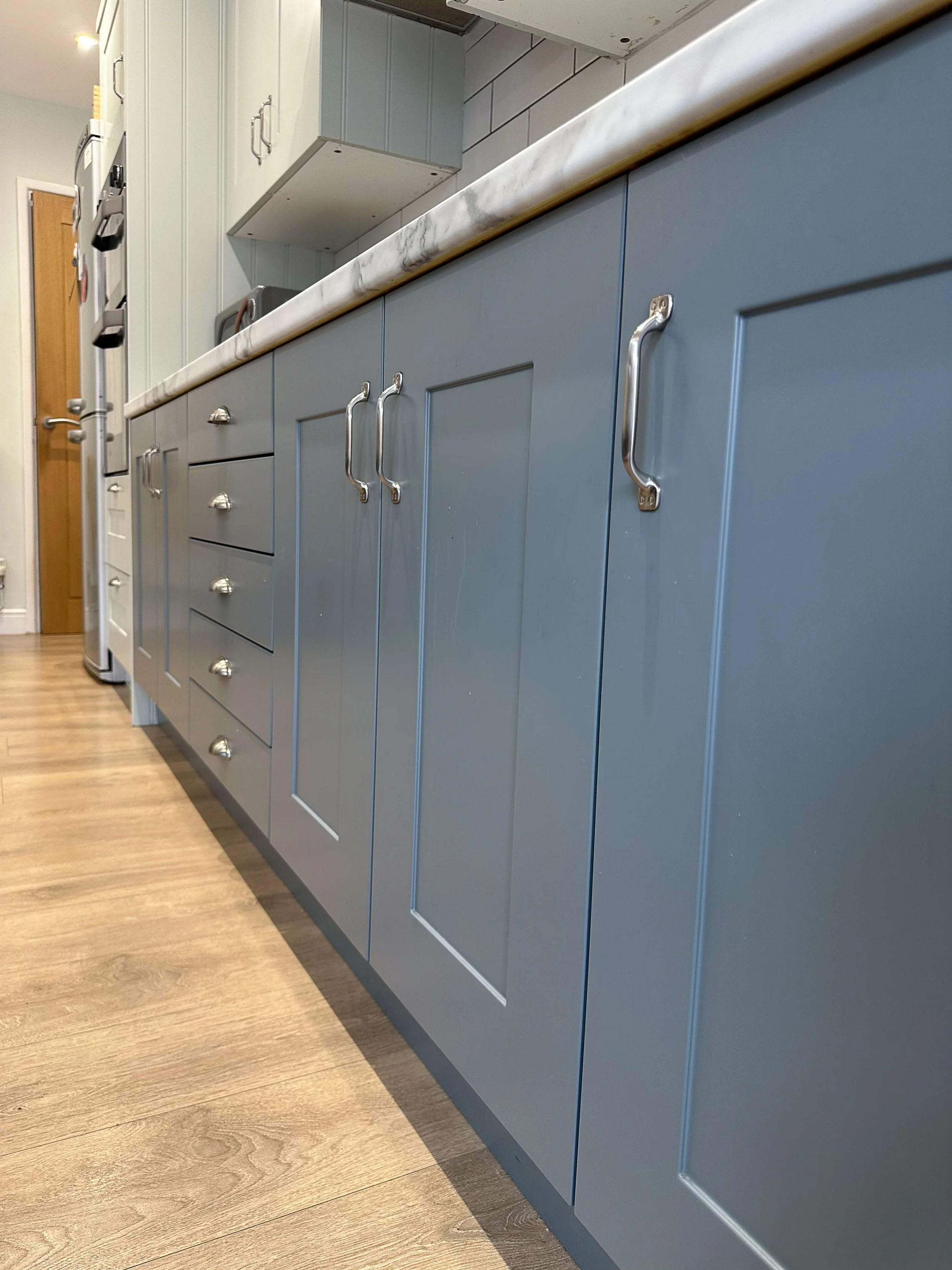 With a strict budget to work within, we worked with our clients to incorporate as many functional yet beautiful features and relied on elegant, but affordable decor - largely from retail stores - to ensure their budget and desired timeline was met. We also utilised their existing kitchen layout and carcasses, plus some of the doors, and managed to work with the original kitchen supplier to incorporate new doors that complemented the existing palette but also refreshed the overall look: pairing mint green with a dark rich grey to keep the scheme fresh, while being grounded with the warm, natural tones in the flooring, furniture and panelling.